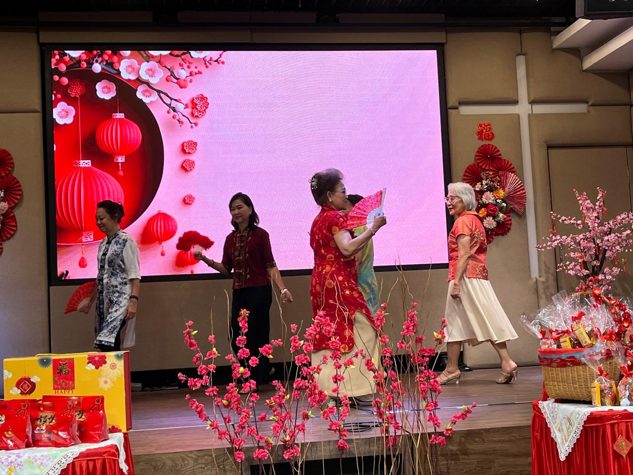 Setelah doa berkat dari Pdt. Suhud, acara dilanjutkan dengan perayaan. Pdt. Erma dan Linda bertindak sebagai pembawa acara, mengajak jemaat menyanyikan lagu “Mari Kita Bersukacita”, dilanjutkan dengan ucapan selamat Tahun Baru Imlek dari seluruh pengurus berserta Pdt. Erma dan Pnt. Toba. Jemaat begitu bersukacita membalas ucapan tersebut. Helena Ocha dan teman-teman mempersembahkan tarian, diiringi musik bernuansa Mandarin. Mereka membawakan tari kipas dengan luwes.