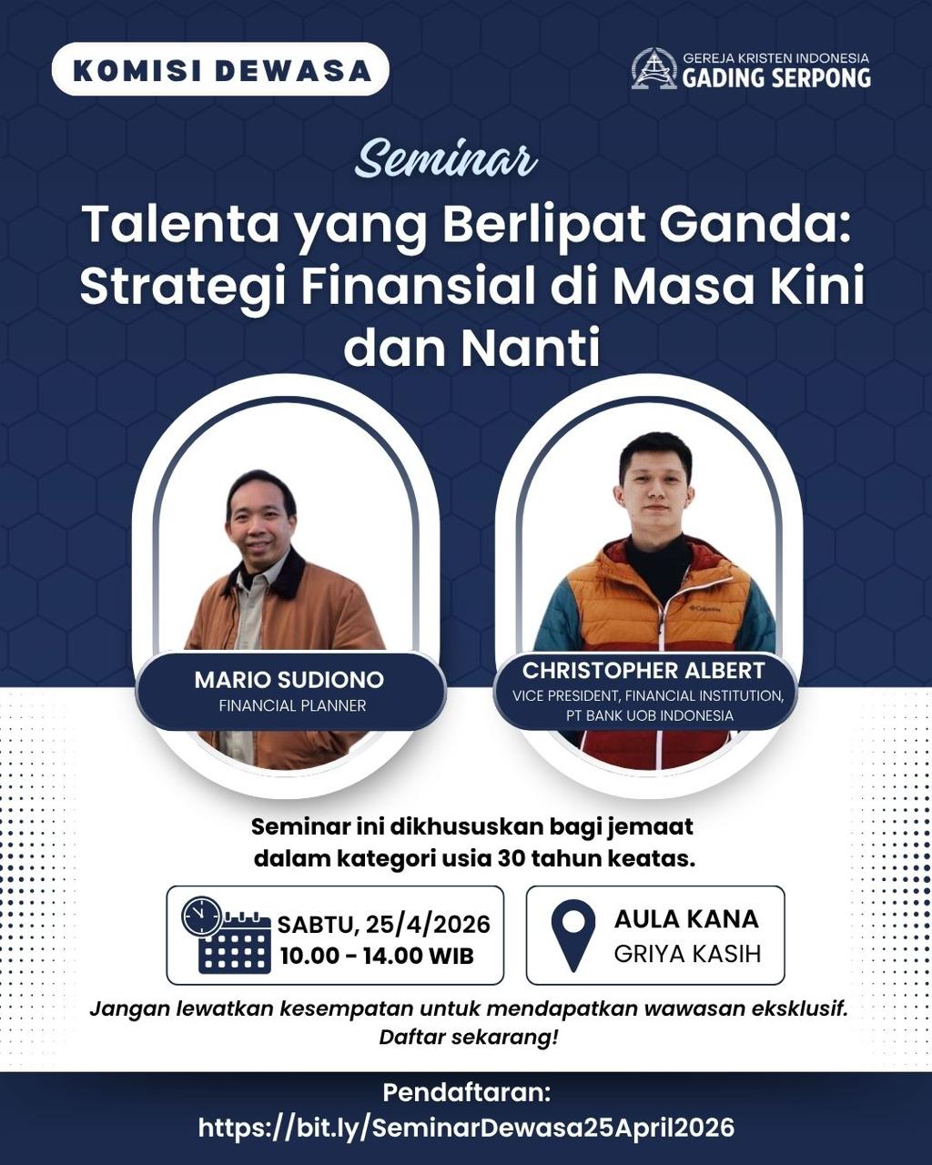Seminar pasutri kembali digelar oleh sie Pasutri Muda, Komisi Dewasa GKI Gading Serpong pada 14 Februari 2026, bertepatan dengan hari Valentin. Acara dilangsungkan pukul 18.00–20.30 di Aula Kana, Griy...