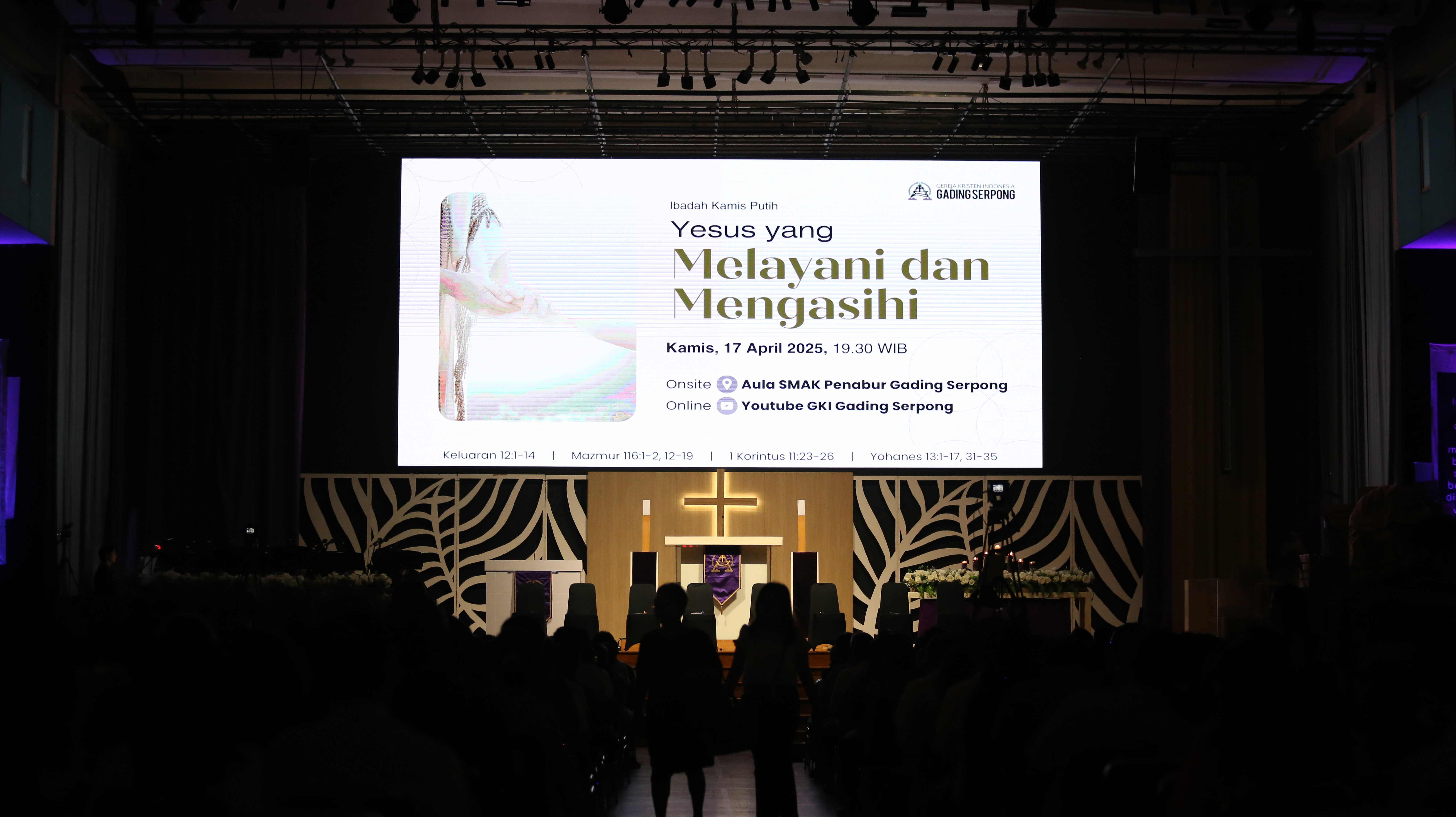 Dalam memperingati Tri Hari Suci, GKI Gading Serpong menyelenggarakan ibadah Kamis Putih, yang dilaksanakan pada hari Kamis, 17 April 2025, mulai pukul 19.30 di aula lantai 6 SMAK Penabur Gading Serpong, Jl. Kelapa Gading Barat, Pakulonan Barat, Kecamatan Kelapa Dua, Kabupaten Tangerang. Ibadah dihadiri oleh 295 orang jemaat pria dan 417 jemaat wanita, dengan tema “Yesus yang Melayani dan Mengasihi”. Ruangan dibuat bernuansa gelap hampir sepanjang ibadah, yang berlangsung selama kira-kira satu jam lima belas menit, dalam suasana yang khidmat.